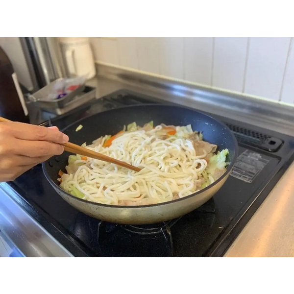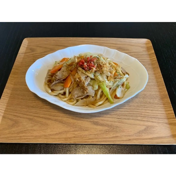 Yaki Udon, made with thick and chewy udon noodles, features a thicker sauce and more pronounced flavor compared to Yaki Soba, which is made with thin Chinese noodles. Japanese tend to eat Yaki Udon as a main dish at home, and it is also commonly served in Okonomiyaki restaurants alongside okonomiyaki (Japanese savory pancake).