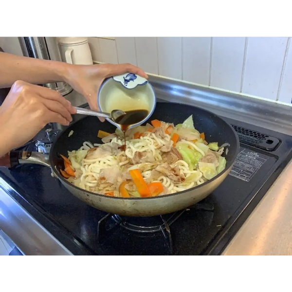 The sauce for Yaki Udon varies depending on the family and region in Japan. It can range from a thick, richly flavored sauce to a lightly seasoned soy sauce base, or even an umami dashi-flavored sauce. Instead of pork, variations using shrimp or squid, which are also commonly found in Japan, are available.