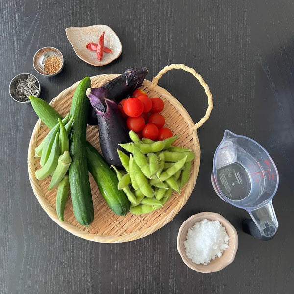 This quick and easy type of Tsukemono is very convenient as you can make it with just a few ingredients. As Asazuke is a simple dish, the taste also depends on the quality and freshness of the vegetables you use. You can use what’s growing in your garden or vegetables in season at your local farmer’s markets. This time, we chose typical Japanese summer vegetables: cucumber, eggplant, okra, edamame, and cherry tomatoes.