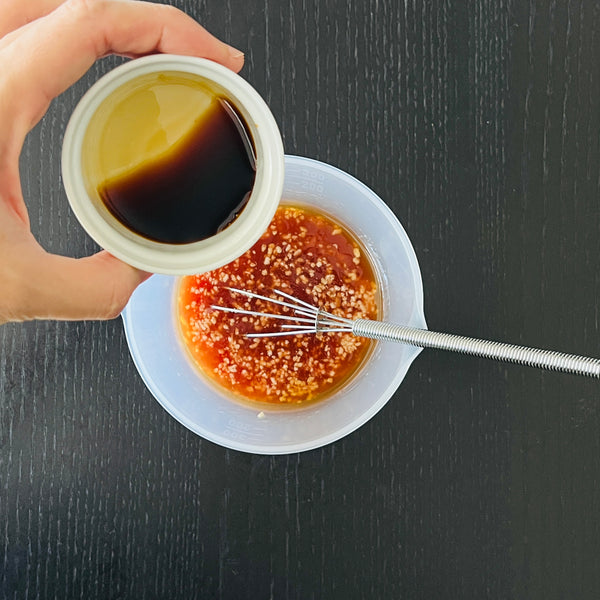Combine the seasonings (ketchup, sake, sesame oil, sugar, powdered chicken soup stock, soy sauce, and water). Mix them well. Set aside for step 7.