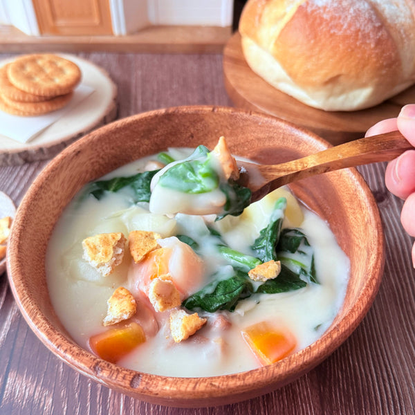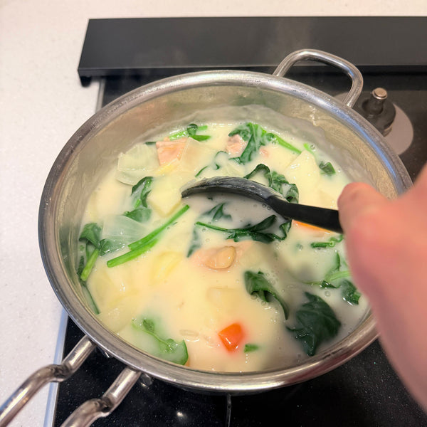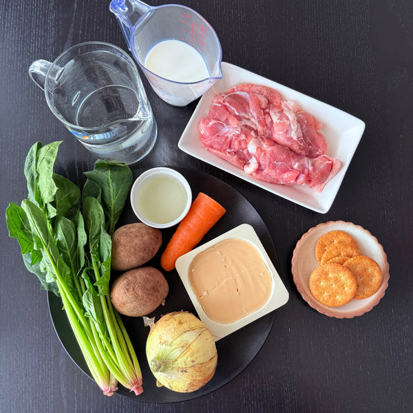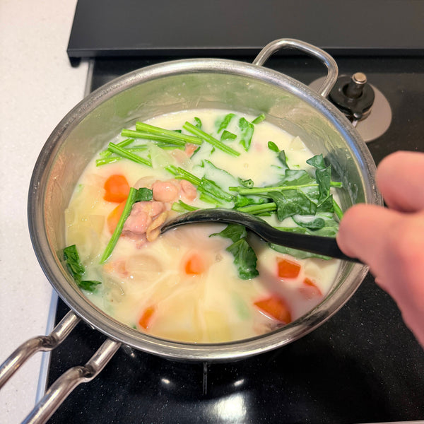 Vegetables (Onion, Carrot, Potato, Spinach) - Onion adds sweetness and umami, while carrot brings vivid color. Potatoes become silky and add a rustic touch, and spinach gives melty leaves with crunchy stems.