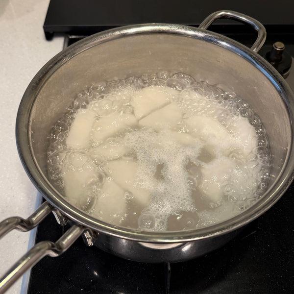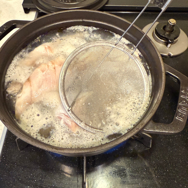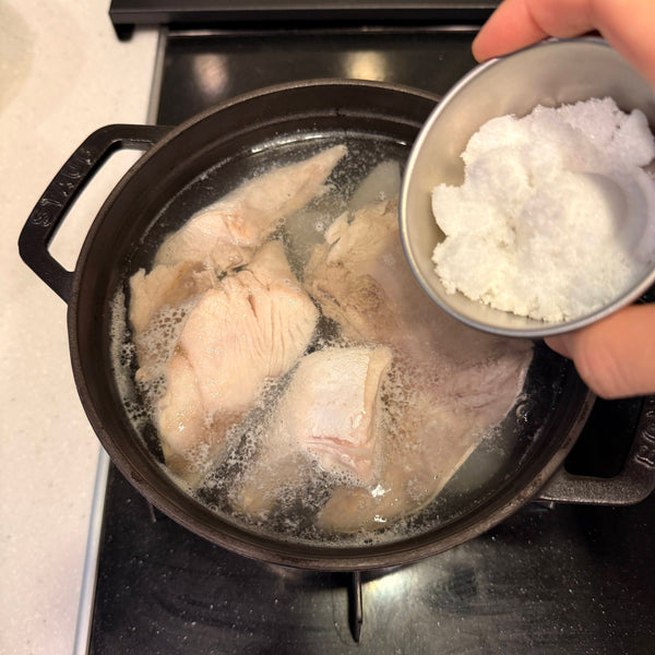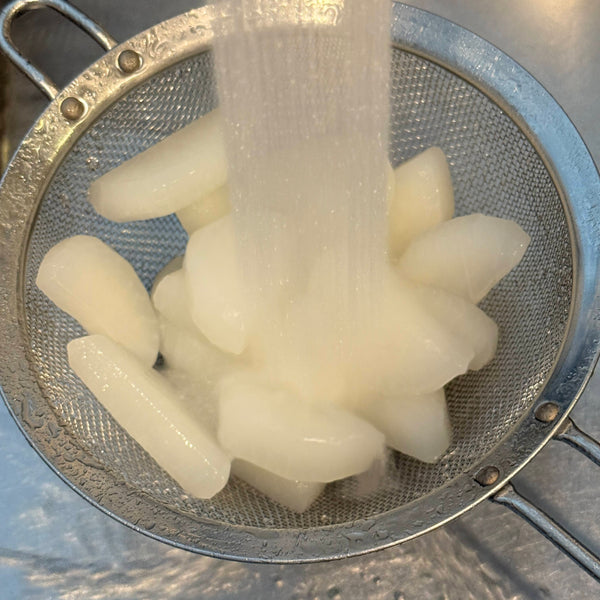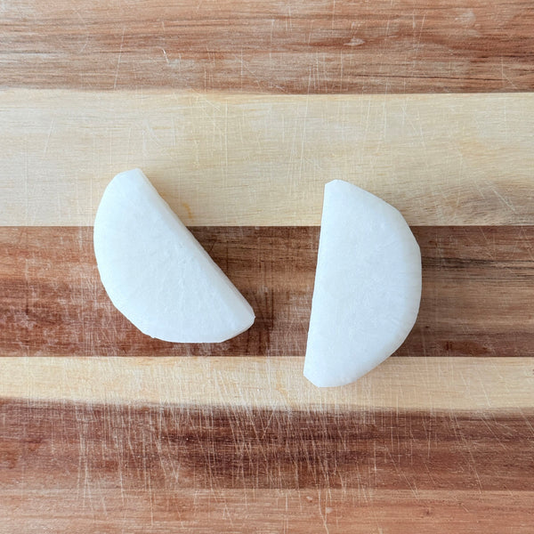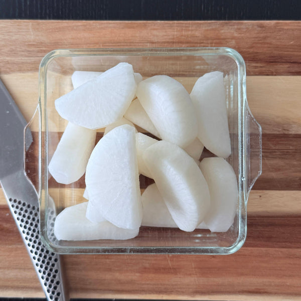 Daikon radish is the other key ingredient. When cooked, daikon becomes tender, juicy, and incredibly flavorful. To ensure the daikon absorbs the broth fully, it is pre-boiled in rice water. The starch in rice water softens the daikon and adds natural sweetness. The second rinse of rice water works best, but you can also simmer it with plain water and a handful of raw rice for similar results.