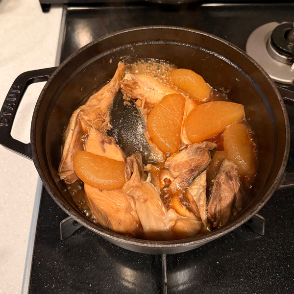 To achieve a rich amber finish, it is important that both the fish and daikon are fully submerged during simmering. Allowing the dish to cool and reheating before serving enhances the color and flavor even more. This resting time is a traditional technique often used in Japanese simmered dishes to deepen taste.