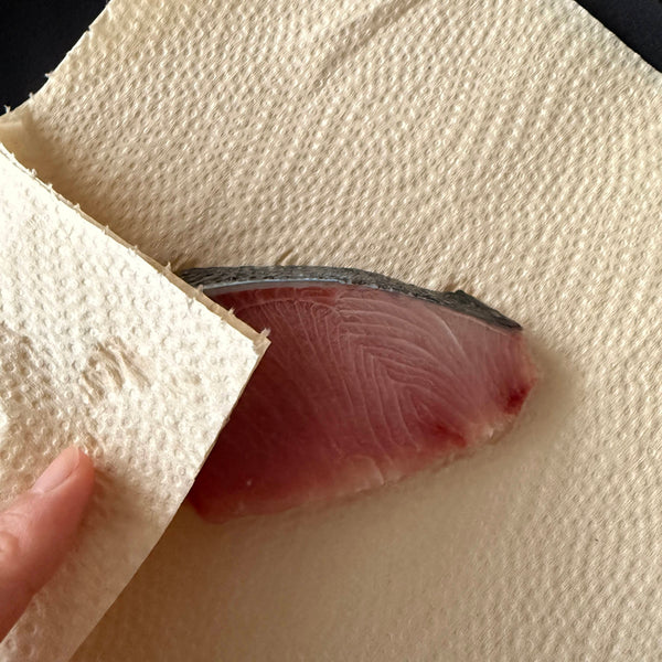 Dipping into hot water – prepare a bowl of hot water and dip the yellowtail fillet for a few seconds. Transfer immediately to cold water, remove any dirt with fingers, then pat dry with paper towels. This method also tightens the flesh, preventing the fish from breaking while cooking.
