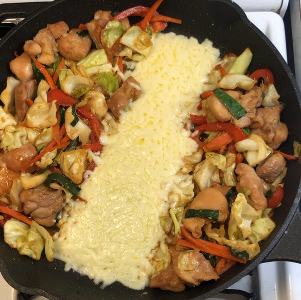 This Japanese-style cheese dak galbi is a cozy, crowd-pleasing dish that brings the spirit of Korean street food into your home kitchen, but with a gentler Japanese flavor profile that’s both comforting and irresistibly cheesy.