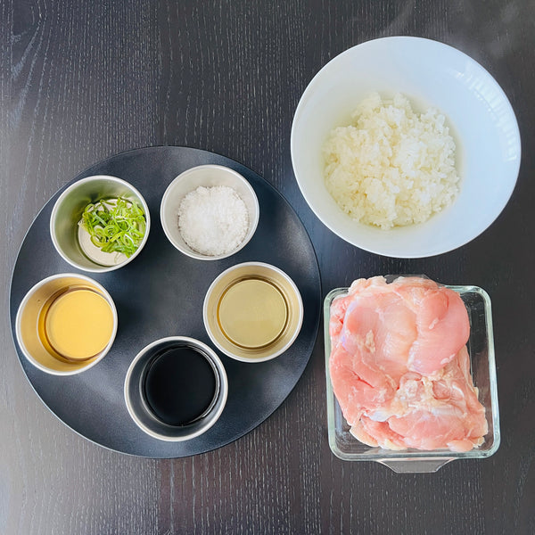 Collect all the necessary ingredients for the recipe: steamed rice, chicken thigh (boneless), soy sauce, mirin, cooking sake, sugar, and chopped green onion (optional).