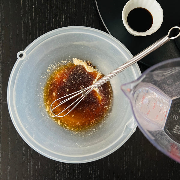 Add the seasoning mixture (from step 2) to the frying pan and bring it to a boil. In the meantime, prepare a small bowl and combine the potato starch and water. Stir until well mixed.