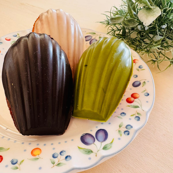 Chocolate, white chocolate, and matcha-dipped madeleine cakes blend French elegance with Japanese flair, featuring buttery sponge cakes and a glossy, flavorful coating.