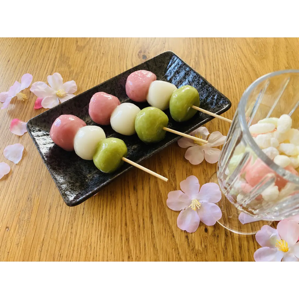 The taste of hanami dango is chewy, tender, and slightly sweet. Traditionally, hanami dango is flavored with Sakura cherry blossoms for pink, and Yomogi, or mugwort for green. The white-colored dango is left plain. Each dango has a different flavor, so you can enjoy a different flavor experience with each bite.