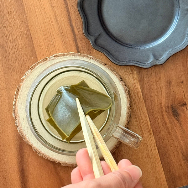 Place the dried kombu seaweed in a cup. Heat 120ml of water to approximately 80℃ and pour it over the kombu. Let it steep for about 5 minutes, then remove the kombu.