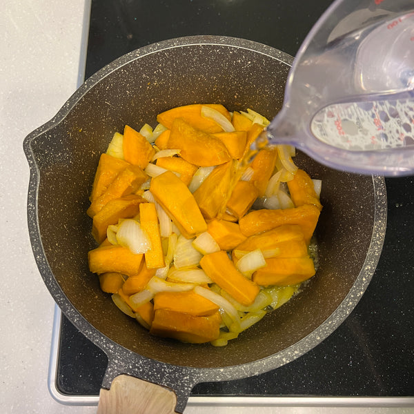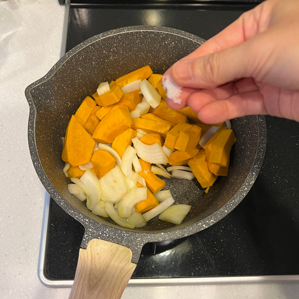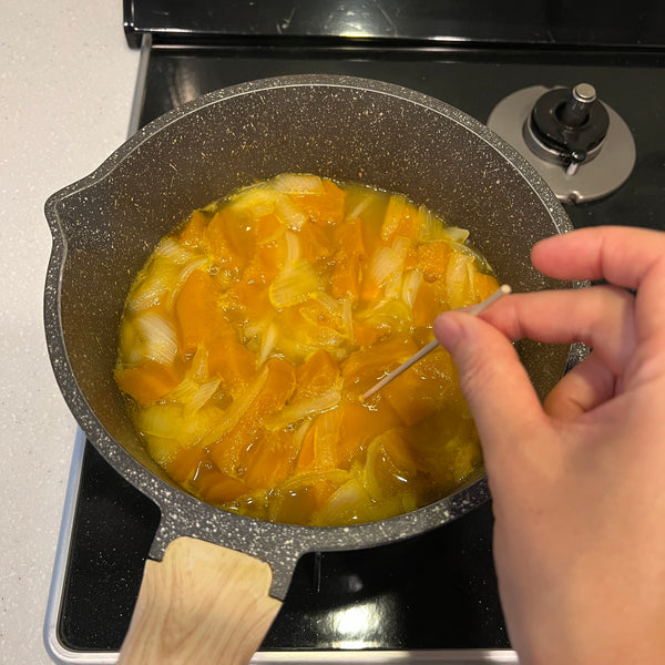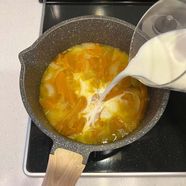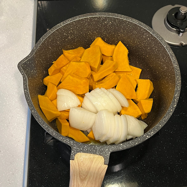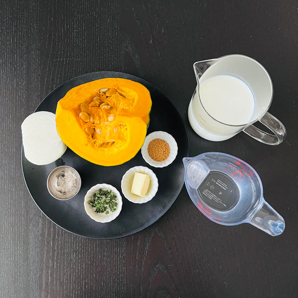 Today, we’re sharing a simple recipe for kabocha soup, made with just four ingredients: kabocha, onion, milk, and butter.