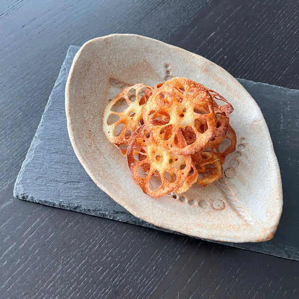 When cutting lotus root, a slicer helps you to make thinner slices. The thinner the slice, the crispier the chip!
