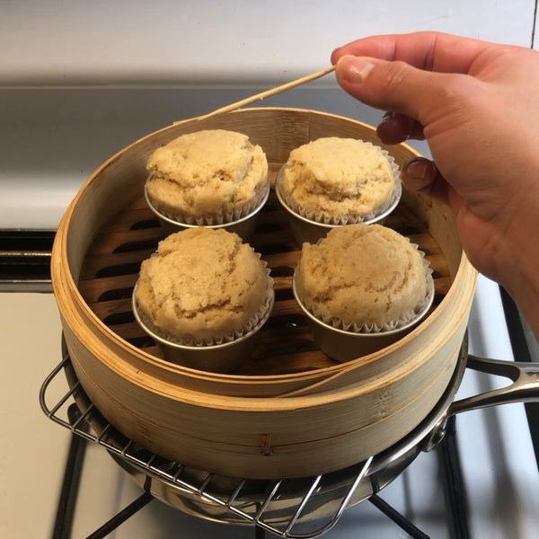 Place the muffin cups in the preheated steamer. Steam over high heat for 10-15 minutes, depending on the depth of the cakes.
