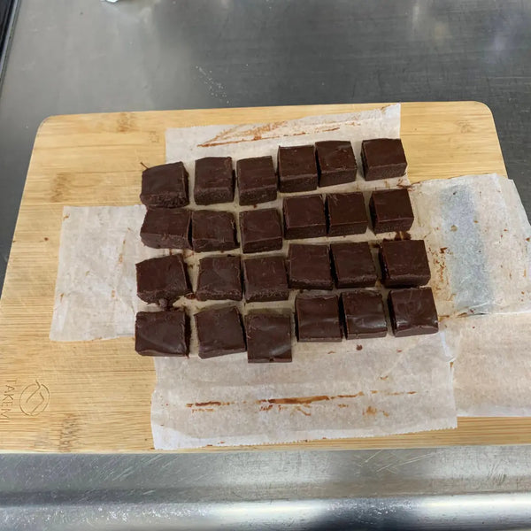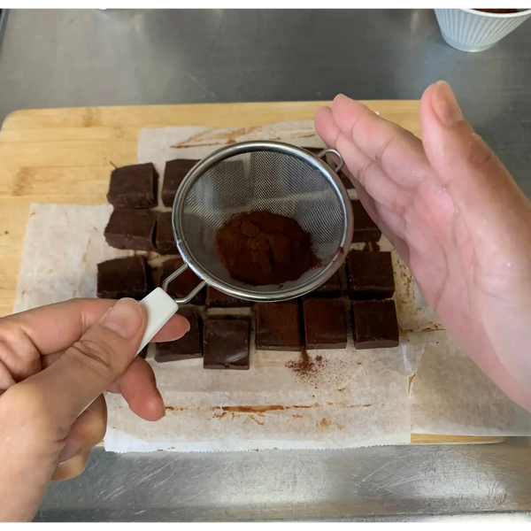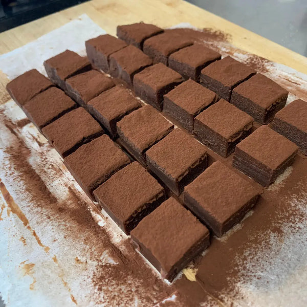 Nama chocolate, which roughly translates to raw chocolate, is a Japanese sweet made by melting chocolate with heavy cream and making a chocolate ganache, letting it set, cutting the final product into smaller pieces, and dusting them with cocoa powder.