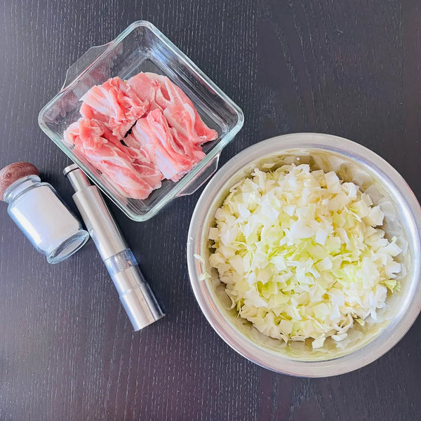 While the batter is resting, prepare the ingredients. Dice the cabbage into 1cm-sized pieces, and cut the sliced pork belly into approximately 5cm portions, then season them with a pinch of salt and black pepper.