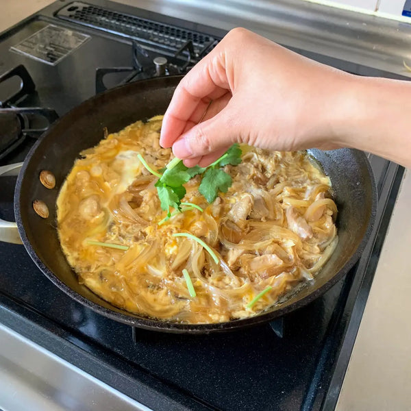Let’s learn about the origins of oyakodon’s name. In Japanese, “oyako” means “parent and child” because it is made of chicken (parent) and egg (child). Also, “don" comes from the word "donburi," which is a large, deep bowl.