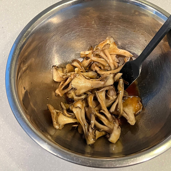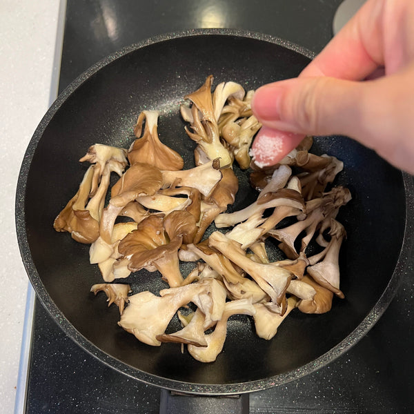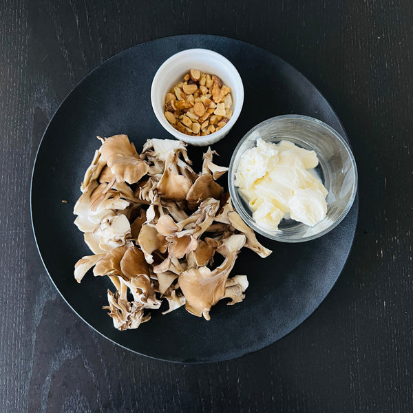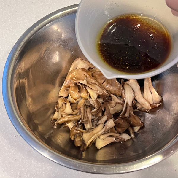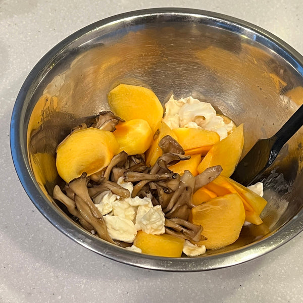 In my recipe, I use maitake mushrooms, also known as “hen of the woods”. They offer a rich umami flavor along with an earthy flavor and a hint of bitterness. The texture is tender, with a slight chewiness, and they are juicy and succulent when cooked. Maitake mushrooms pair well with persimmons, creating a contrast in both taste and texture.