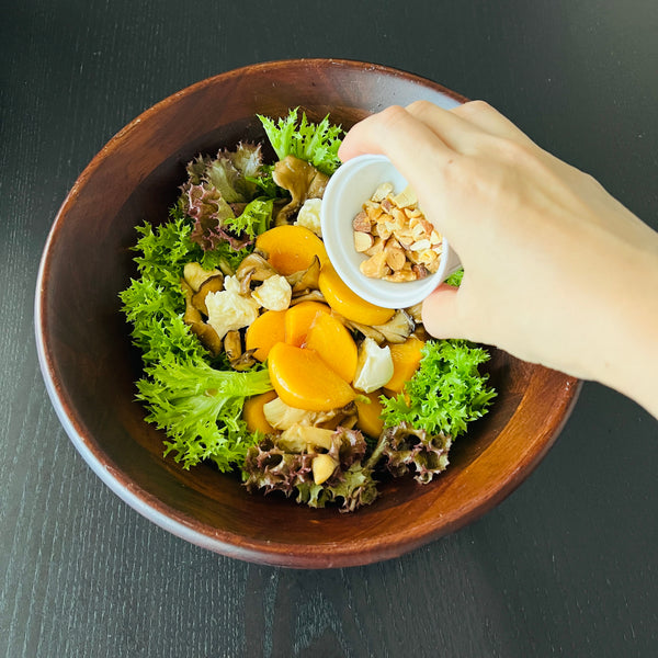 Finally, I’m serving the salad in one bowl as a side dish imagining a gathering setting. However, if you serve it separately on individual plates, it makes for a fancy appetizer. For the topping, I’ve chosen nuts, which enhance the antioxidants when combined with persimmons.