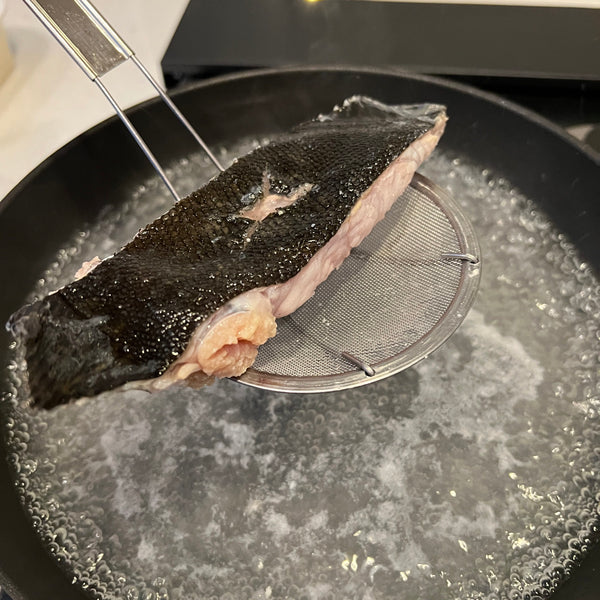 Do “shimofuri” as preparation: Shimofuri is a Japanese technique where fish is briefly soaked in boiling water until the surface turns white. This process helps remove any odor and makes it easier to remove the scales.