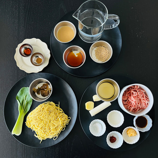 You'll need fresh ramen noodles, sesame oil, Japanese leek, ginger, garlic, and ground pork. For the meat sauce, prepare doubanjiang, sugar, cooking sake, soy sauce, miso, and Sichuan pickles (za-sai). For the broth, you'll need white sesame paste, powdered chicken soup stock, soy sauce, and water. Toppings like bok choy, chili oil (la-yu), and Sichuan pepper are optional but highly recommended.