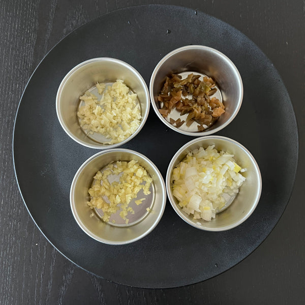 Finely chop the ginger, garlic, Japanese leek, and Sichuan pickles. Make sure each ingredient is cut evenly.