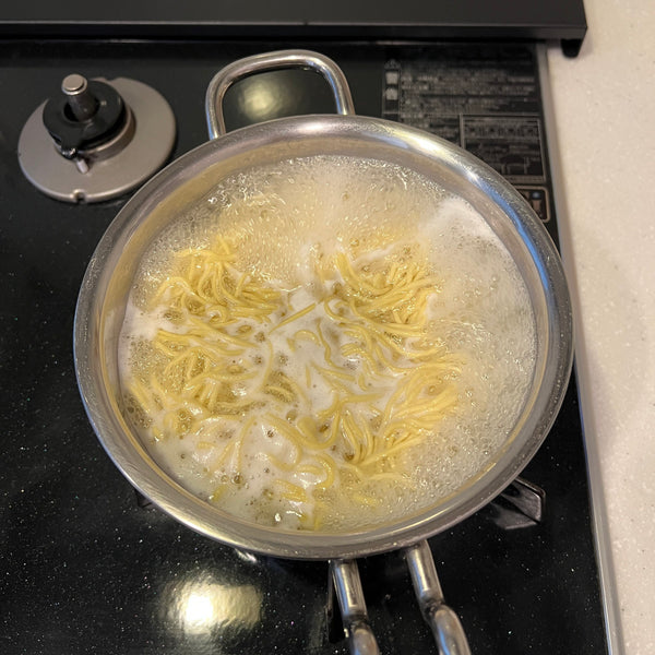 Use the boiling water from Step 5 to cook the noodles according to the instructions on the package. Once cooked, drain thoroughly to remove any excess water.