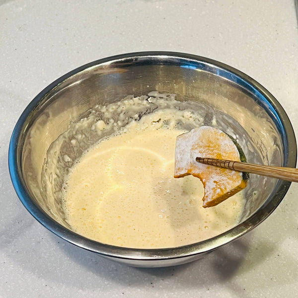 • Use cold water for the batter: When preparing the tempura batter, use cold water to prevent gluten from forming, which can make the texture thick and dense. Avoid overmixing for the same reason, as a light and airy batter is key to achieving crispy tempura.