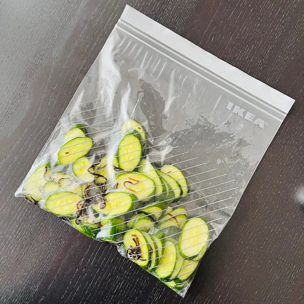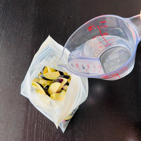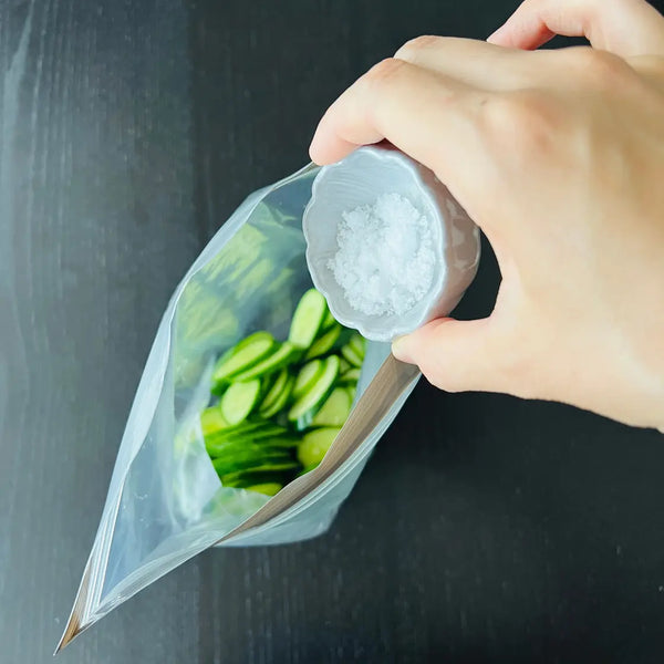 Asazuke pickles are lightly pickled in seasoning (like salt, sugar, and so on) or a seasoning liquid (seasoning+water, vinegar, soy sauce, etc.). In this recipe, we will just use salt as a seasoning and salt water as the seasoning liquid. You can choose whether you just want to use salt or salt water depending on the vegetable.